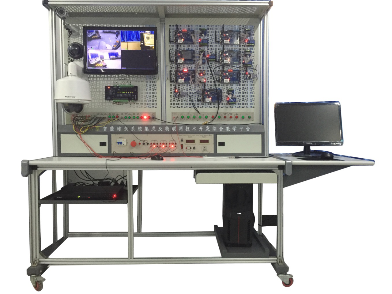 實驗臺架的框架必須采用鋁合金型材組成,實驗桌為鐵質(zhì)雙層亞光密紋噴塑結(jié)構(gòu),桌面為防火、防水、耐磨高密度板,結(jié)構(gòu)堅固,造型美觀大方;實驗桌還設(shè)有四個萬向輪和四個固定調(diào)節(jié)機構(gòu),便于移動和固定平臺帶有漏電保護裝置、急停開關(guān);提供AC220V交流電源接口,可為外配儀器設(shè)備提供工作電源;配有一組DC 0~30V/2A連續(xù)可調(diào)直流電源;帶有數(shù)字電壓、電流表;直流穩(wěn)壓電源:提供+5V、+12V、+24V各一路直流電源,每路均具有短路、過流保護。