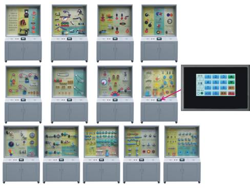 《機械設計基礎》示教陳列柜 一、概述: 《機械設計基礎》示教陳列柜是根據教育部高職高專規(guī)劃教材設計的電化教學設備。演示形象逼真,運行可靠,制作工藝美觀,使用本陳列柜可提高教學效果,是一套現(xiàn)代化機械課程教學實驗室設備。 二、技術規(guī)格: 1、本陳列柜共分十三個單體陳列柜組成,陳列柜體外形尺寸:1200×530×1900mm(長×寬×高) 2、具有多功能語音播放控制系統(tǒng)。語音解說同步演示,采用單獨驅動由電腦或電子設備控制運轉演示。控制采用液晶觸摸屏控制和遙控控制自動運行講解、可循環(huán)與重復播放運轉,又能根據教材、教學需要而任意選擇還是單獨演示等。解說詞播放在100平方房內聲音宏亮。 3、柜體采用SPCC冷扎板焊接而成,表面采用中溫磷化噴塑制作,柜體剛性好。柜內陳列面板為超豪華鋁塑夾層板,承載性好。板面附有必要的圖表和文字說明,外形美觀大方,經久耐用。 4、柜頂部裝有照明日光燈,柜背設有對開門,有利維護設備和方便維修。柜下部設有柜箱,方便存放單個模型、實驗箱及相關實驗文檔。柜底裝有萬向輪,方便移動,符合人機工程要求。 5、模型材料采用亞克力有機板與工程塑料制造; 三、《機械設計基礎》示教陳列柜,各柜內容如下: 序號和名稱 柜內模型內容 第1柜、 機器的組成及特征 單缸內燃機、顎式破碎機、縫紉機、運動副(滾動體、嚙合中的一對齒廓、滑塊與導槽、轉動副、移動副) 第2柜、 平面連桿機構 五桿鉸鏈機構、曲柄滑塊機構、鉸鏈四桿機構、大篩機構、曲柄搖桿機構的極位夾角、攪拌機、慣性篩機構、機車車輛機構、鶴式起重機、轉動導桿機構、曲柄搖塊機構、曲柄移動導桿機構、雙轉塊機構、雙滑塊機構、有急回特性的機構、夾緊機構 第3柜、 凸輪機構 內燃機配氣機構、靠模車削機構、自動送料機構、分度轉位機構、不同鎖合方式的凸輪(靠重力鎖合)、不同鎖合方式的凸輪(滑輪式彈簧力鎖合)、不同鎖合方式的凸輪(擺桿式彈簧力鎖合)、不同鎖合方式的凸輪(等寬凸輪機構)、不同鎖合方式的凸輪(槽凸輪機構) 第4柜、 間歇運動機構 矩形齒雙向棘輪機構、棘輪機構、鉤頭雙動式棘爪、直頭雙動式棘爪、槽輪機構、空間槽輪機構、六角車床上的槽輪機構、外嚙合不完全齒輪機構、內嚙合不完全齒輪機構、凸輪式間歇運動機構 第5柜、 帶傳動 同步帶、張緊輪裝置(圓帶傳動)、張緊輪裝置(平帶傳動)、帶的定期張緊裝置(滑道式)、帶的定期張緊裝置(擺架式)、帶的自動張緊裝置、V帶輪的結構(實心帶輪、腹板帶輪、孔板帶輪、橢圓輪輻帶輪) 第6柜、 鏈傳動 鏈傳動、齒形鏈、雙排滾子鏈、滾子鏈、滾子鏈接頭型式(開口銷固定銷、彈簧卡固定銷、過渡鏈節(jié))、鏈輪結構(實心式、孔板式、焊接式、螺栓聯(lián)接式)、鏈傳動的張緊(水平布置式、夾角小于45°式) 第7柜、 齒輪的傳動 內齒圈傳動、齒輪齒條傳動、圓錐齒輪傳動、雙曲線圓錐齒輪傳動、斜齒圓錐齒輪傳動、螺旋齒輪傳動、斜齒輪齒條傳動、蝸輪蝸桿傳動、弧面蝸輪蝸桿傳動、正齒輪傳動、斜齒輪傳動、人字齒輪傳動 第8柜、 齒輪的基本性質 齒輪各部分名稱(外齒輪、內齒輪、齒條)、斜齒條的壓力角、漸開線的形成、輪齒折斷(疲勞折斷、疲勞裂紋)、齒面點蝕、齒面膠合、齒面磨損、漸開線曲面形成(直齒輪、斜齒輪)、斜齒圓柱齒輪的受力分析、圓錐齒輪的受力分析、齒輪軸(圓柱齒輪軸、圓錐齒輪軸)、腹板式圓錐齒輪、鑄造輪輻式圓柱齒輪、仿形切制齒輪、展成法切制齒輪 第9柜、 齒輪系 定軸齒輪系(平面定軸輪系、空間定軸輪系)、平面行星齒輪系、空間行星齒輪系、可變向的齒輪系、汽車后橋差速器、擺線針輪傳動機構、諧波齒輪傳動、減速器、行星減速器中的齒輪系 第10柜、 其它常用零件、部件 套筒聯(lián)軸器、凸緣聯(lián)軸器、多片式摩擦離合器、齒輪聯(lián)軸器、彈性套柱銷聯(lián)軸器、彈性柱銷聯(lián)軸器、雙萬向聯(lián)軸器、牙嵌式安全離合器、滾柱式超越離合器、板彈簧 第11柜、 螺紋聯(lián)接和螺旋傳動 螺紋的牙型(三角、矩形、梯形、鋸齒形)、螺紋的旋向(左旋、右旋)、螺紋的線數、螺距和導程(單向右旋、雙線左旋)、螺栓聯(lián)接、雙頭螺栓聯(lián)接、螺釘聯(lián)接、緊定螺釘聯(lián)接(平端、錐端)、彈簧墊圈、對傾螺母 尼龍圈鎖緊螺母、槽形螺母和開口銷、圓螺母用帶翅墊片、柔性螺栓(空心桿螺栓、腰狀桿螺栓)、止動墊片、沖點法防松、粘合法防松、永久防松、串聯(lián)聯(lián)鋼絲、用減載銷、用減載套筒、用減載鍵、螺栓承受偏心載荷(螺母下有凸點、螺栓頭部不平、鉤頭螺栓)、凸臺沉頭座的應用(凸臺、沉頭座)、斜面墊圈的應用、受橫向載荷的螺栓組聯(lián)接、改善螺紋牙間載荷分布、螺母下裝彈性元件、金屬墊片和密封環(huán)密封(平墊片、密封環(huán))、螺旋千斤頂、機床刀架進給機構、插管式外循環(huán)滾動螺旋 第12柜、 軸和軸轂聯(lián)接 傳動軸、光軸、階梯軸、空心軸、曲軸、圓螺母定位、彈性擋圈固定、堅定螺釘固定、壓板軸端固定裝置、平鍵聯(lián)接、導向平鍵聯(lián)接、滑鍵聯(lián)接、楔鍵聯(lián)接、切向鍵聯(lián)接、半圓鍵聯(lián)接、花鍵聯(lián)接(矩形花鍵、三角形花鍵、漸開線花鍵)、 第13