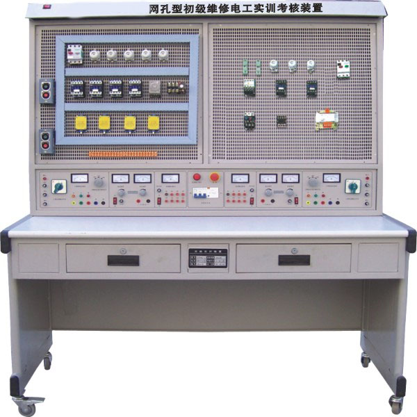 ZYWK-88A 網(wǎng)孔型初級維修電工實訓考核裝置(雙組型) 一、概述 初級維修電工實訓考核裝置主要由實訓桌、網(wǎng)孔板、實訓元器件(也可自購)組成。學生根據(jù)實訓線路進行元器件的合理布局,安裝、接線全部由學生自行完成,接近工業(yè)現(xiàn)場。能完成機床線路,電機控制線路,照明配電的模擬操作、安裝調試的綜合實訓,訓練學生動手能力和實操技能。實訓項目可自行確定,根據(jù)所選的項目選擇相應的元器件。該裝置也可作為電工考工的考核設備。 二、特點 1 、電氣控制線路元器件都裝在網(wǎng)孔板上,操作方便、更換便捷、易擴展功能或開發(fā)新的實訓項目(增購元器件即可增加相應實訓項目)。 2 、操作臺只需三相四線的交流電源即可投入使用,占地面積小、節(jié)約實訓用房、減少基建投資、經(jīng)濟效益顯著。 3 、實訓臺配備兩組相互獨立的電源,互不干擾,即可以兩個學生同時進行實訓。 4 、設有電壓型漏電保護器和電流型漏電保護器,能確保操作者安全,電源輸出均有監(jiān)視及短路保護等功能,使用安全可靠。 三、技術性能 1 、輸入電源:三相四線制~ 380V±10% 50Hz 2 、溫度: -5℃ ~ + 40℃ ,相對濕度< 85% ( 25℃ ) 3 、裝置容量:< 1.5KVA 4 、外形尺寸: 1600mm × 750mm × 1690mm 四、實訓臺配置 1 、公共部有:設有電壓型漏電和電流型漏電保護,外部電源輸入有指示燈指示,設有急停按鈕,遇緊急情況按下按鈕切斷實訓臺總電源。 2 、每組提供線電壓 380V 或相電壓 220V 兩種電源,單相電源插座、線電壓輸入指示表。 3 、每組提供 3V 、 6V 、 9V 、 12V 、 18V 、 24V 、 36V 低壓交流電源。 4 、每組提供一路恒流穩(wěn)壓電源,電壓 0-30V ,最大電流 3A ,內置式繼電器自動換檔,多圈電位器連續(xù)調節(jié),有數(shù)字表指示電流電壓值。 5 、實訓桌為鐵質雙層亞光密紋噴塑結構,桌面為防火、防水、耐磨高密度板,結構堅固,造型美觀大方,桌子左右有抽屜,下部有元件儲存柜。 五、參考實訓項目 1 .電工布線工藝實訓 2 .兩個開關控制一盞燈線路訓練 3 .聲控開關控制白熾電路訓練 4 .二地控制一盞燈電路訓練 5 .三地控制一盞燈電路訓練 6 .日光燈線路接線訓練 7 .單相電度表直接安裝接線 8 .單相電度表經(jīng)電流互感器安裝接線 9 .室內照明電路安裝訓練 10 .配電板安裝訓練 11 .交流負載電功率的測量 12 .三相異步電動機直接啟動控制 14 .三相異步電動機接觸器自鎖控制線路 15 .三相異步電動機 Y/△ 自動控制線路 16 .用倒順開關控制三相異步電動機正反轉線路 17 .接觸器聯(lián)鎖的正反轉控制線路 18 .按鈕聯(lián)鎖的三相異步電動機正反轉按鈕線路 19 .雙重聯(lián)鎖的三相異步電動機正反轉按鈕線路 20 .三相異步電動機多地控制 21 .工作臺自動往返控制線路 22 .三相異步電動機串電阻降壓啟動控制線路 23 .三相異步電動機能耗制動控制線路 六、參考實訓項目所需元器件清單(每組配備清單) 注:本裝置每臺需配兩套元器件,用戶也可自行購買。